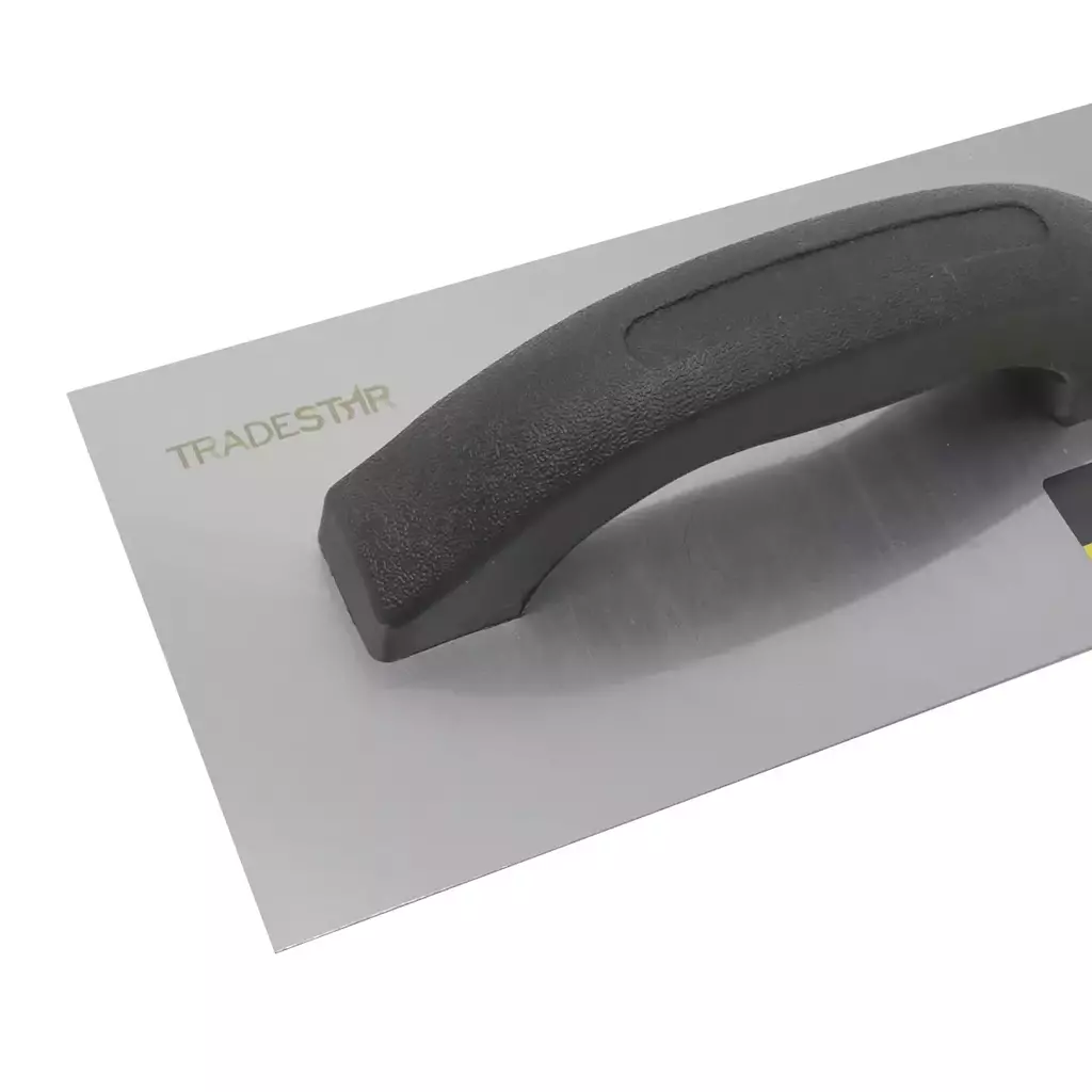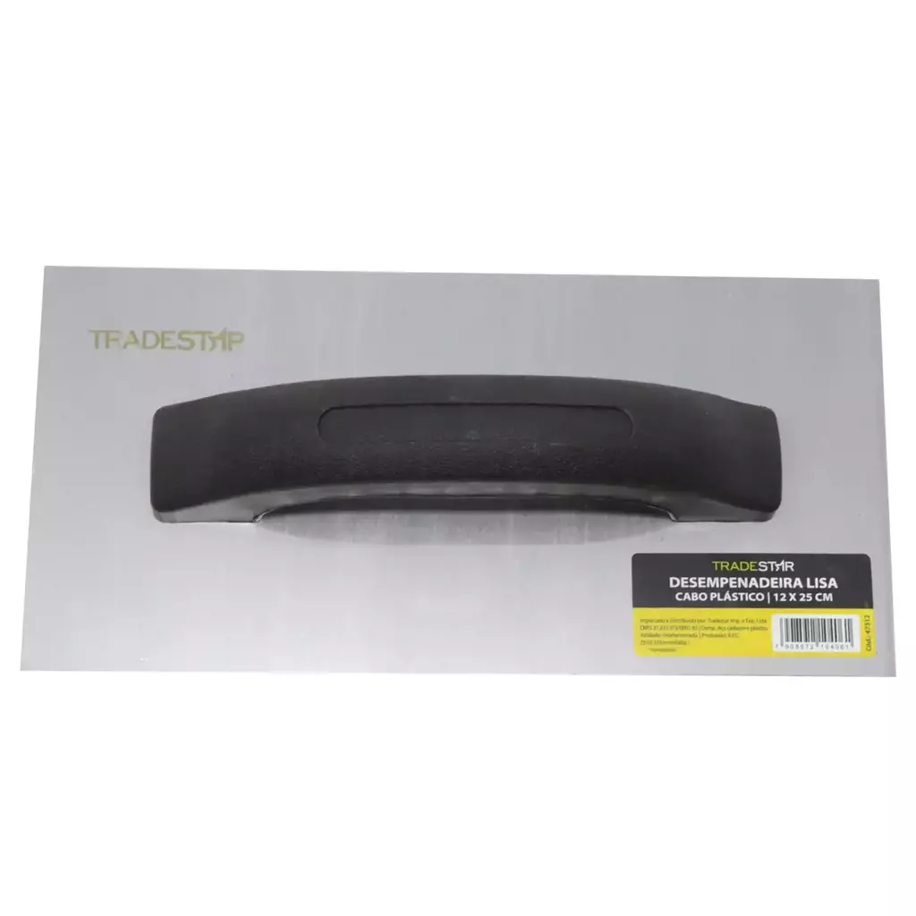 Desempenadeira Aço Lisa 12x25Cm Cabo Lisa Cabo Plástico Tradestar utilizada para construção e acabamento de superfícies de reboco e argamassa. Com Espátula retangular e uma lâmina de aço plana e lisa na parte inferior, que é usada para aplicar, nivelar e alisar materiais como argamassa, reboco, gesso e outros revestimentos em paredes, tetos e pisos.
